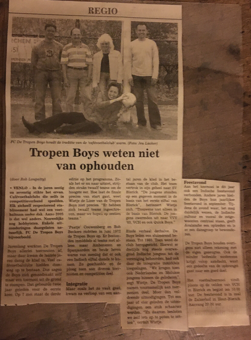 Het zal in de wedstrijd tegen Merefeldia zijn geweest dat een van de Tropenboys (Joke) een vrije trap van de scheidsrechter kreeg toegewezen. Hij nam een aanloop en gaf de bal een harde trap richting de scheidsrechter. De bal scheerde met een vaart over het hoofd van de goede man en nam tot grote verwondering van het publiek, de pruik van de scheidsrechter mee.